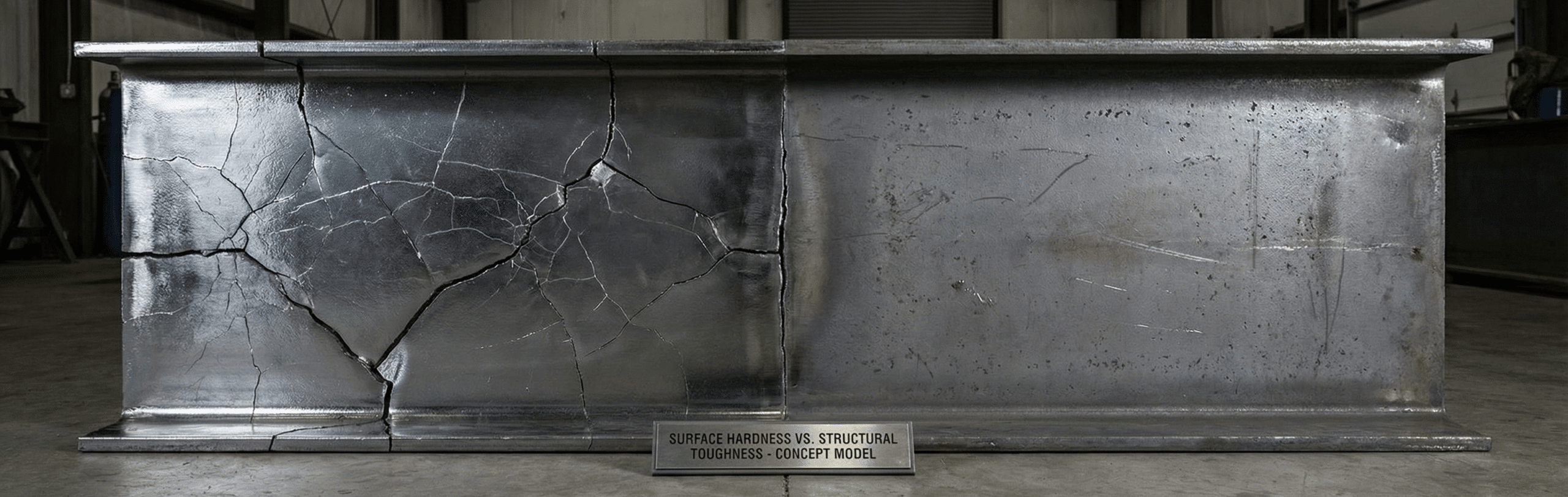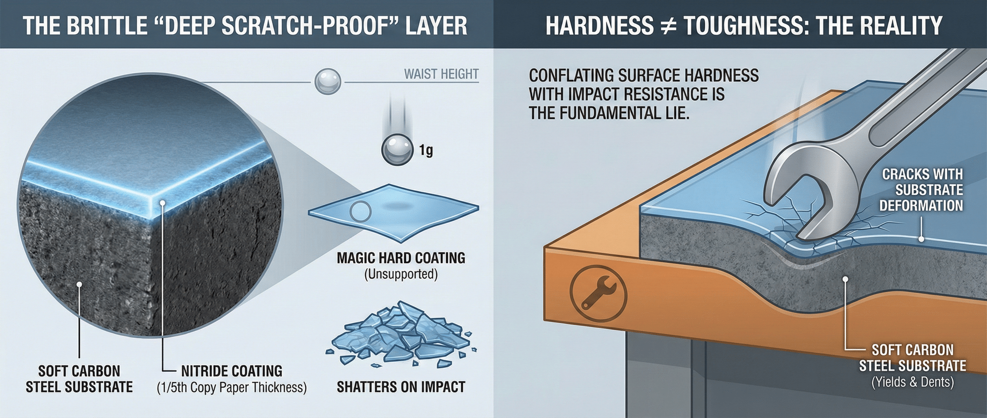 The reason the nitrided table surface doesn’t instantly shatter when you drop a wrench on it isn’t because the coating is tough. It’s because the soft carbon steel substrate underneath absorbs the impact by yielding (denting). The hard coating rides along with the substrate deformation, cracking as it goes.