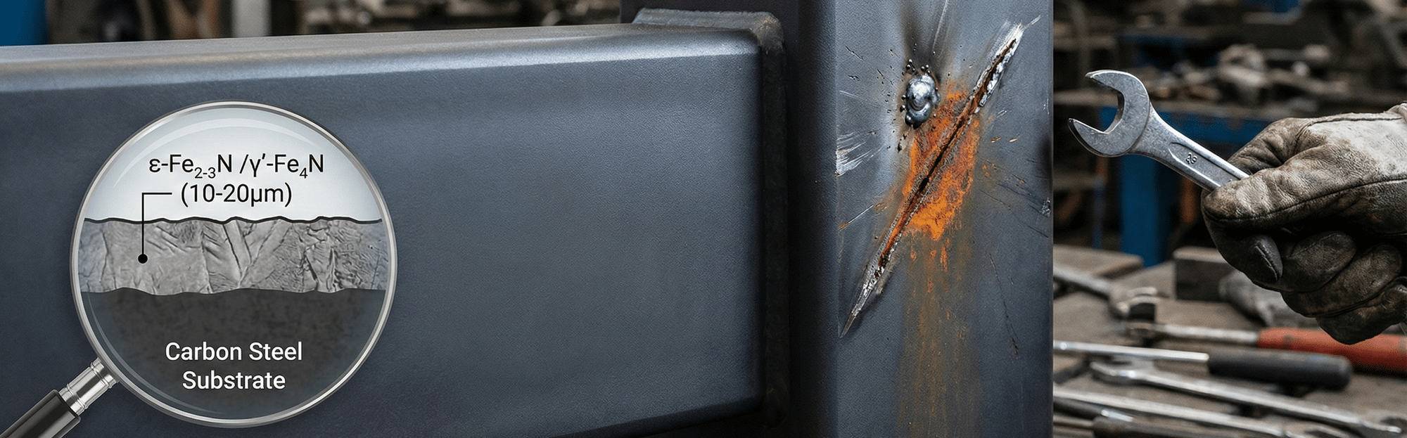 The compound layer (also called the white layer): A thin outermost layer of iron nitride phases, primarily ε-Fe₂₋₃N and γ′-Fe₄N. This is the hard, nitrogen-rich layer that provides wear resistance. Its thickness is the critical number for this entire discussion.