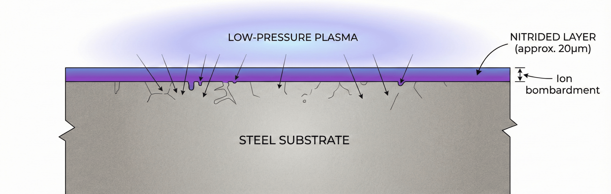 Plasma nitriding (also called ion nitriding or glow-discharge nitriding) is a thermochemical surface treatment performed in a vacuum chamber. The workpiece is made the cathode in an electrical circuit. A mixture of nitrogen and hydrogen gas is introduced at low pressure (typically 1-10 mbar). A high DC voltage (300-1000V) is applied between the chamber wall (anode) and the workpiece (cathode), generating a glow discharge plasma around the surface. Nitrogen ions in this plasma are accelerated toward the workpiece surface by the electric field, where they are implanted into the metal lattice via ion bombardment and subsequent thermal diffusion.