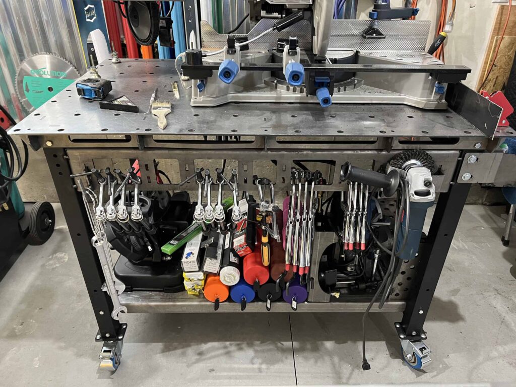 If you stop by our shop, you’ll see most of our 30″ x 48″ welding tables outfitted as follows: Welding Table Base Shelf, two Super Slot Tool Holder, our Sidewall Addition with 10″ X 10″ Vise Mount, one 6″ Super Slot Bin, and our Super Slot Grinder Hanger. We also have components from our 30″ x 48″ Welding Table Starter Accessory Pack.
