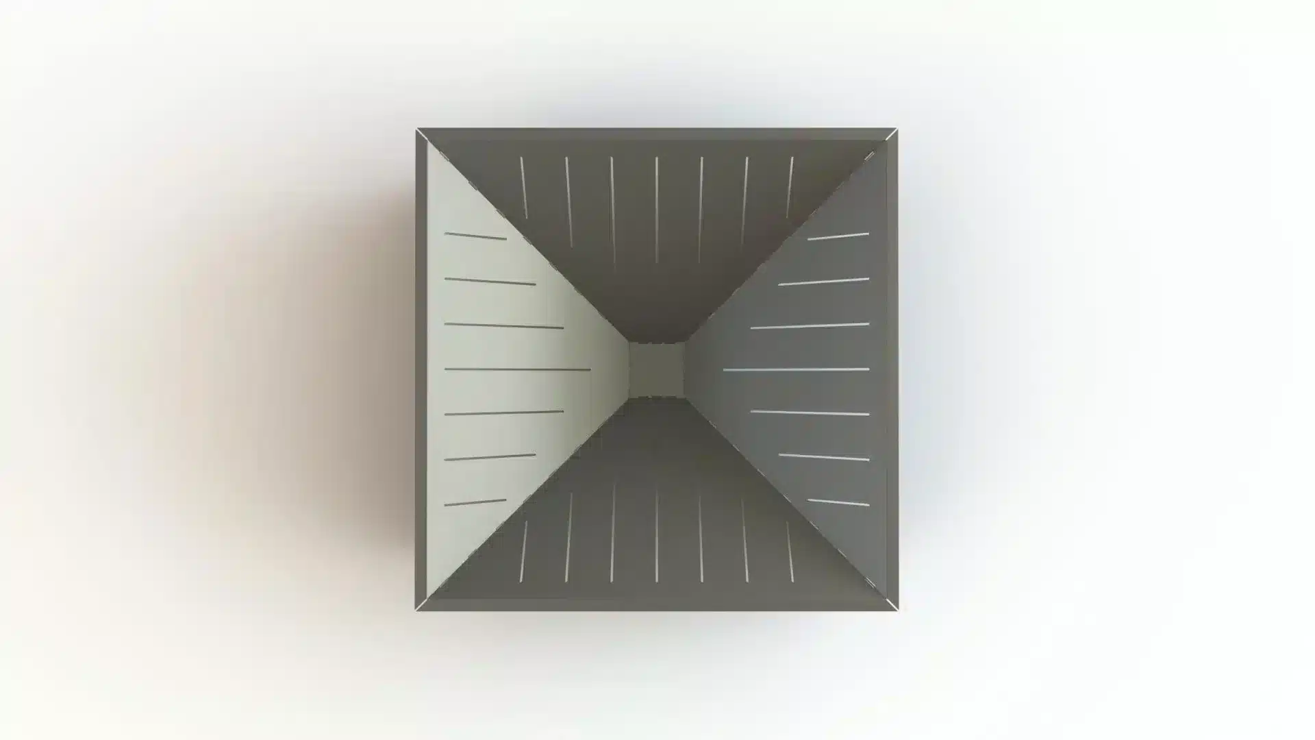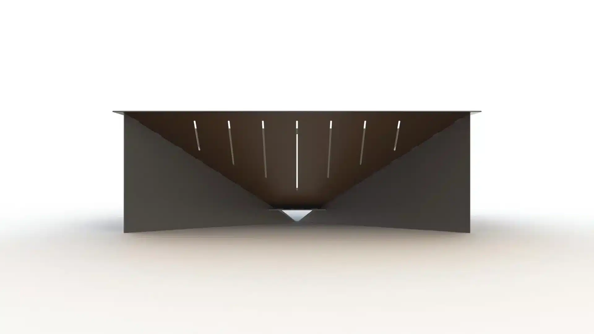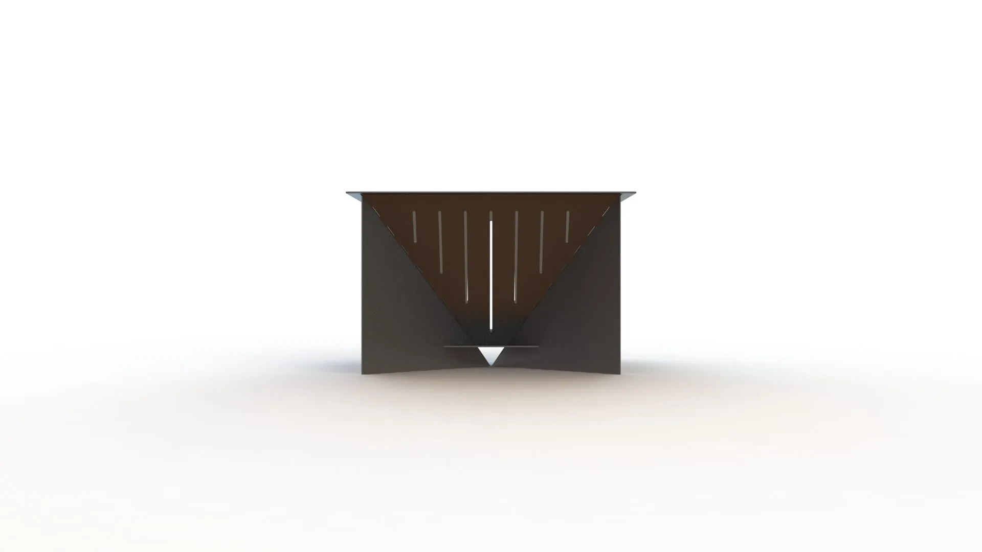 Meet the GEOMA Firepit: a striking, inverted pyramid design crafted from 11ga steel. Four sloping triangular panels converge downward to create the fire chamber, while a set of supports extend from each seam to the ground forming an X-shaped base from corner to corner—a clever structural twist that balances both form and function. Air slots are cut into the panels to keep the fire well-ventilated, ensuring a robust, long-lasting burn.