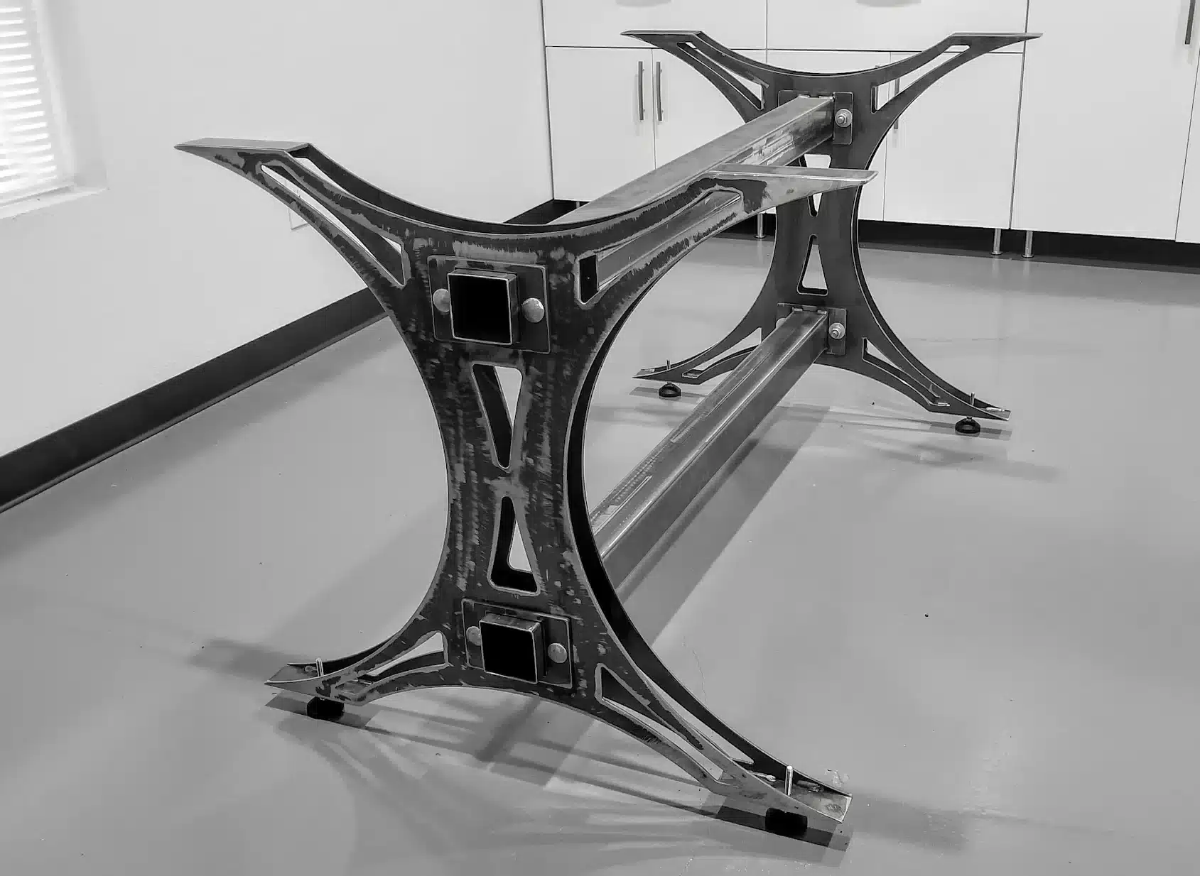 Inspired by the robust machinery of 1920s factories, the XAVAX Table Base channels the raw, salvaged feel of vintage industrial work while boasting modern precision. Its design features two X-shaped end sections forged from dual 3/16″ plate steel, evoking the substantial, timeworn quality of factory relics.