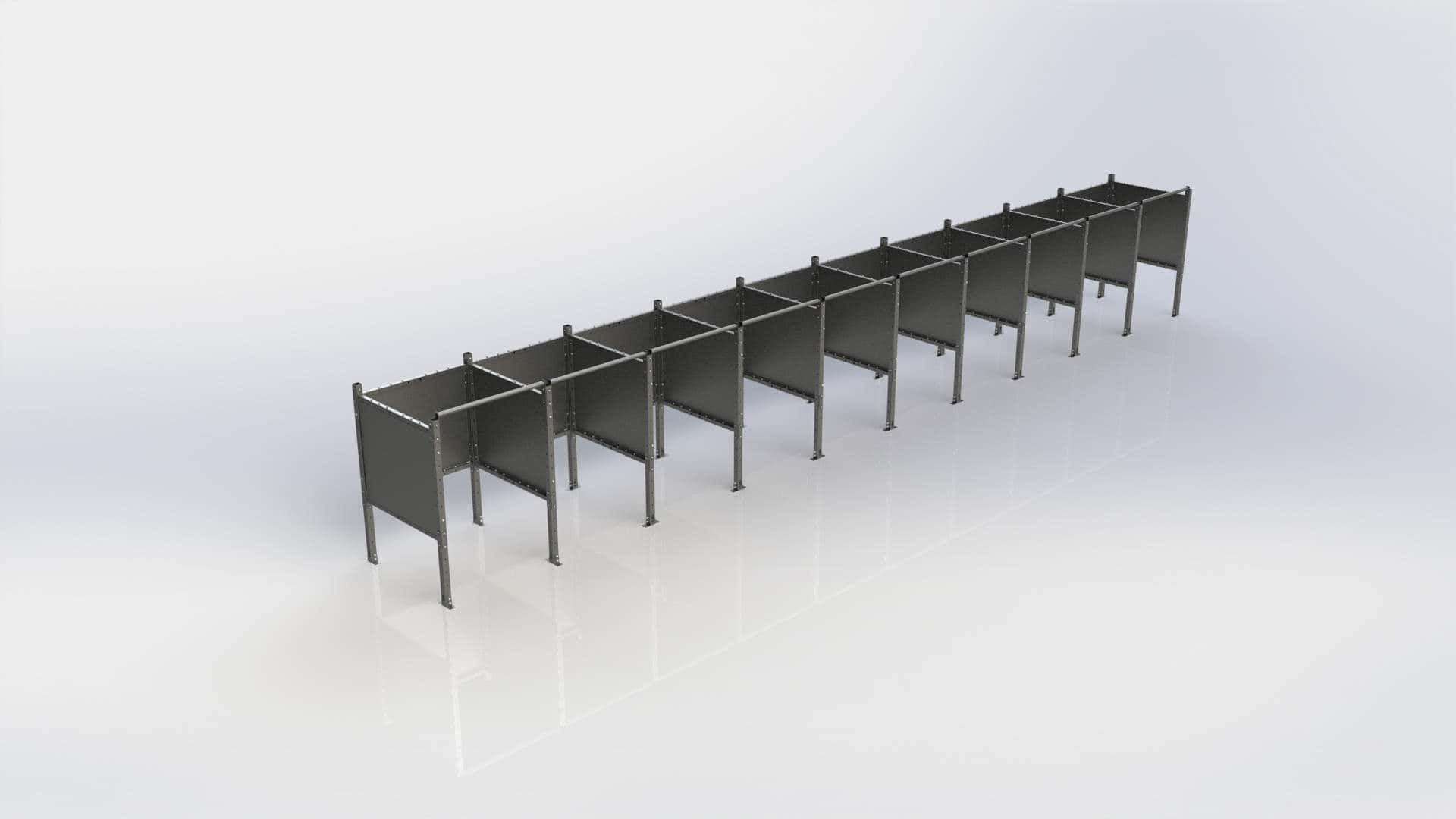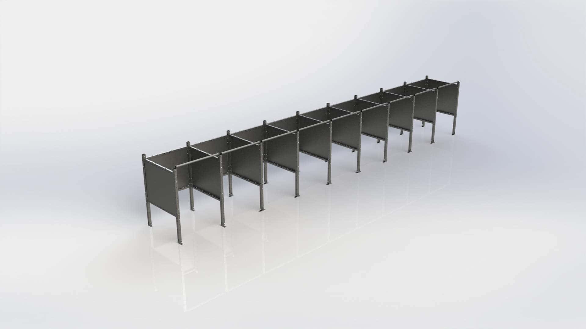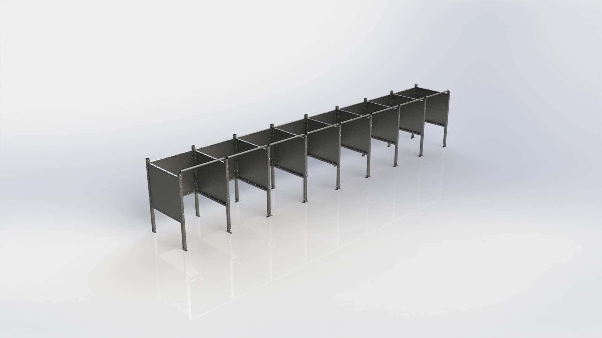• Columns: We utilize heavy-duty 3″ square tubing uprights at each corner of every station, plus additional uprights in the center of any span over 8 foot long for strength, and to allow for future expansion.