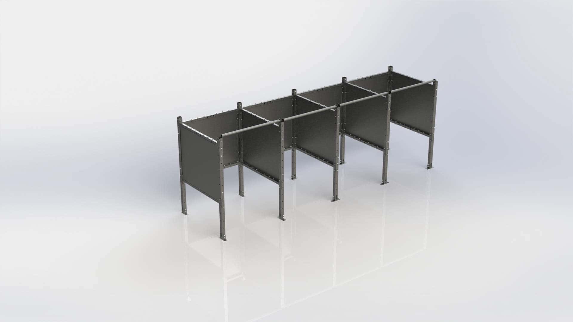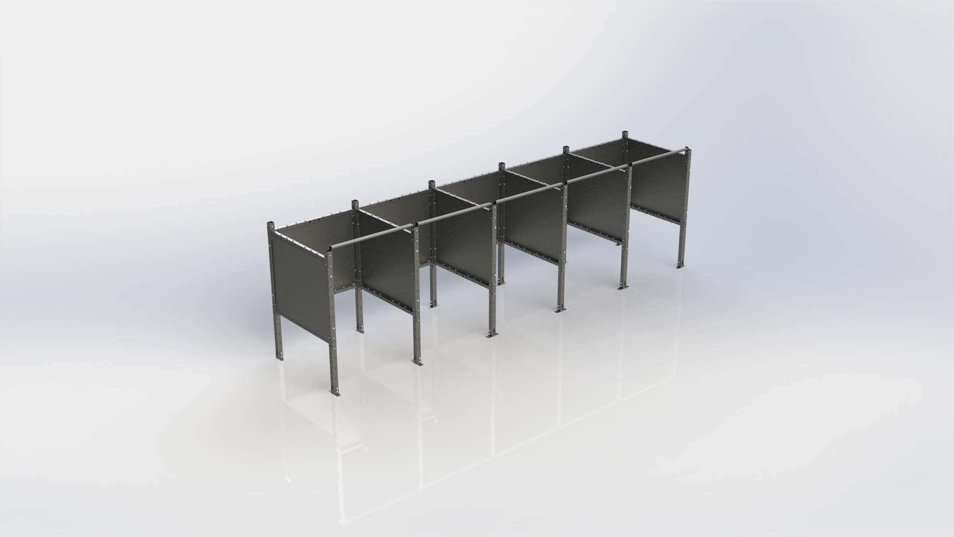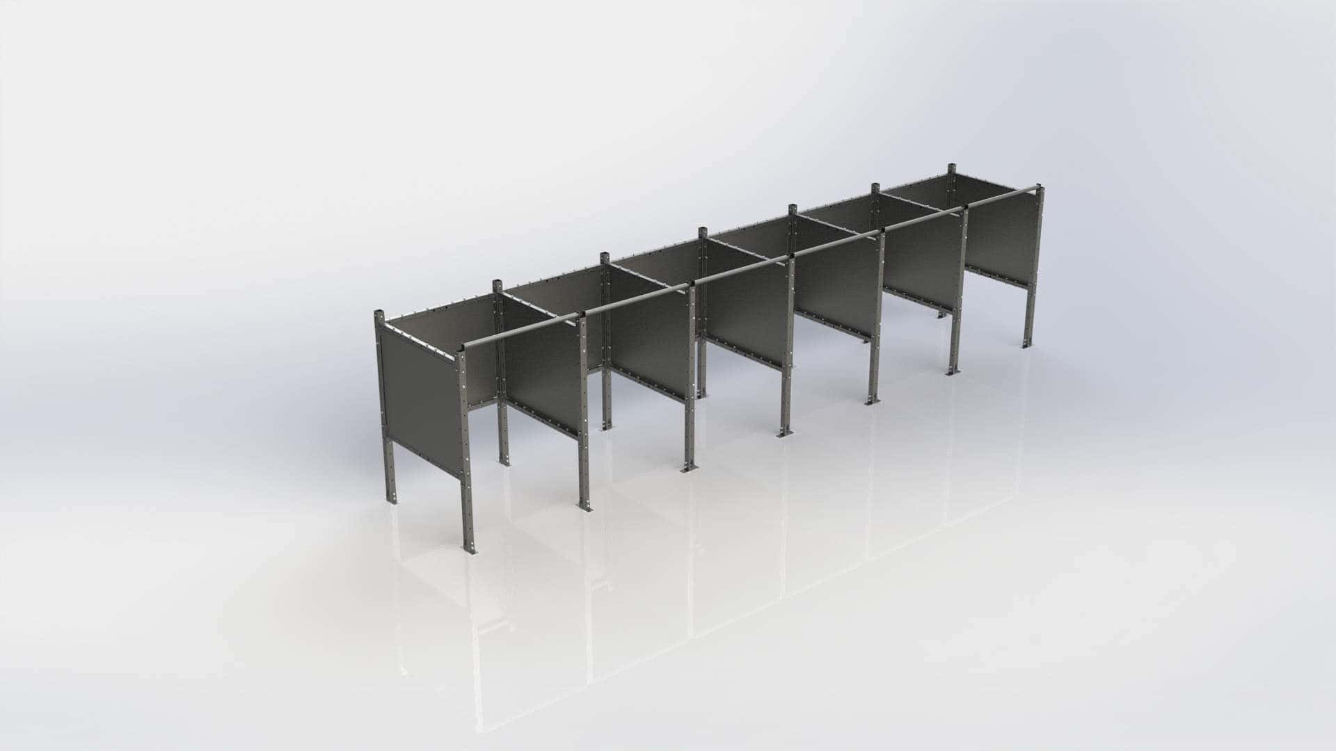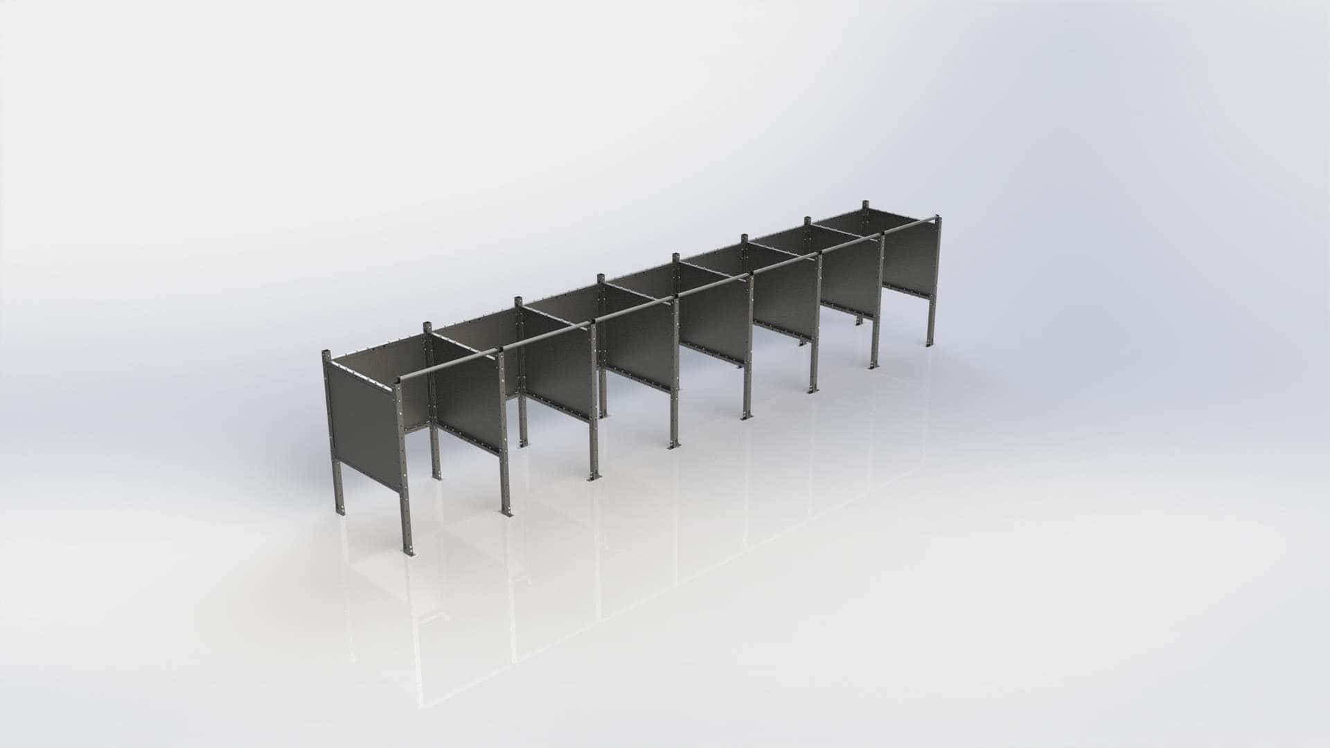 • Columns: We utilize heavy-duty 3″ square tubing uprights at each corner of every station, plus additional uprights in the center of any span over 8 foot long for strength, and to allow for future expansion.