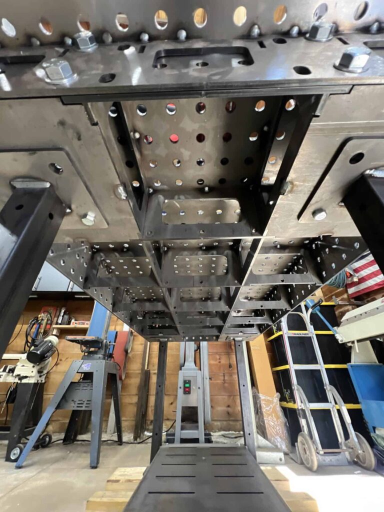 As you might guess, fabricating a huge table with precision requires extraordinary effort and a lot of practice. But we also augment our fabricator’s experience with the best tools available. In addition to using 142 bolts, 132 feet of threaded rod, 63 fixturing plates and making hundreds welds – we also fabricate all of our table on a heavy duty milled reference surface!